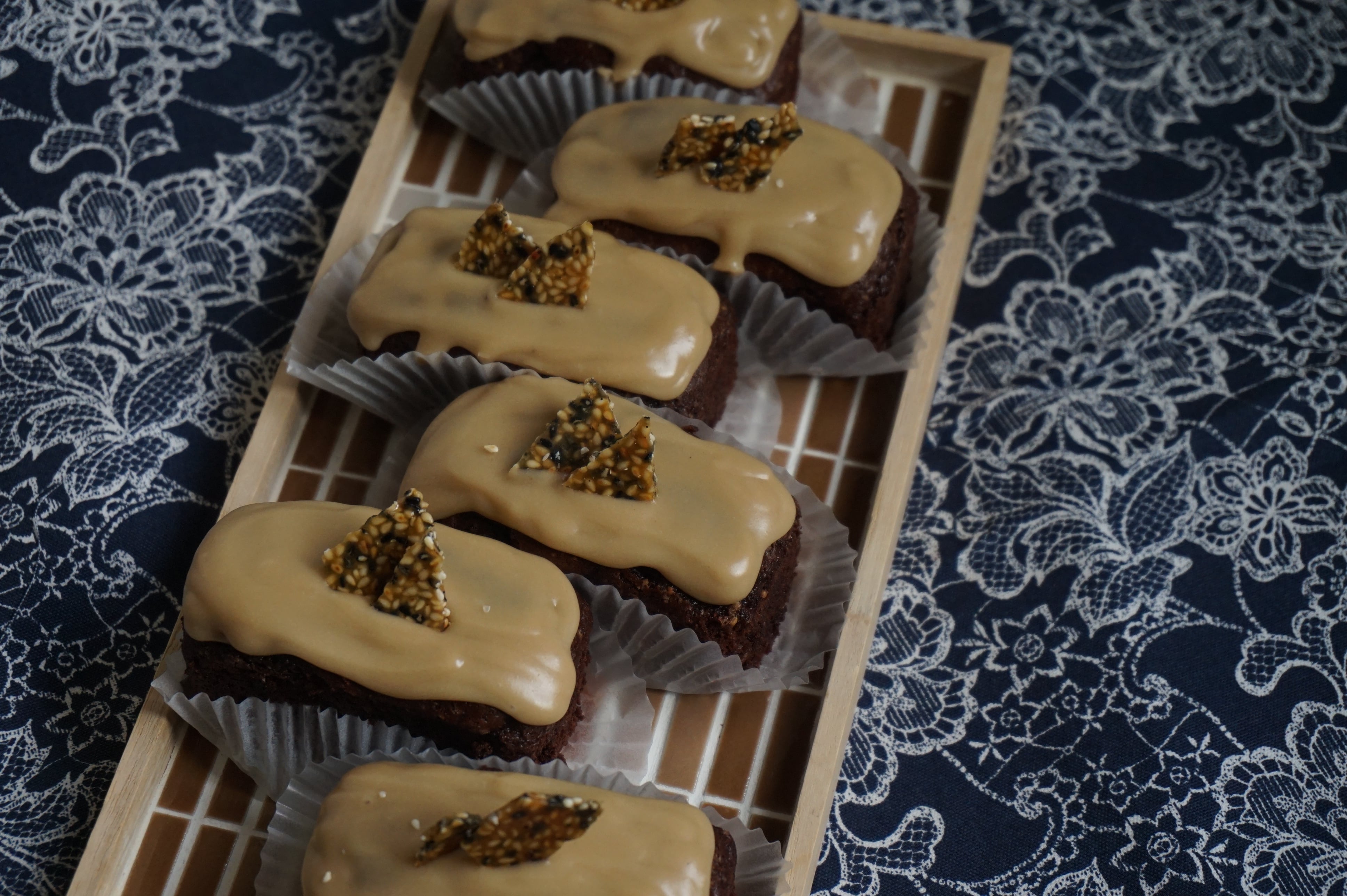 原材料:ブラウンシュガー、牛乳、小麦粉、卵、ひまわり油、タヒニペースト、ココアパウダー、砂糖、白胡麻、黒胡麻、バター、ゴールデンシロップ、粉糖、レモン汁、塩/膨張剤、バニラオイル