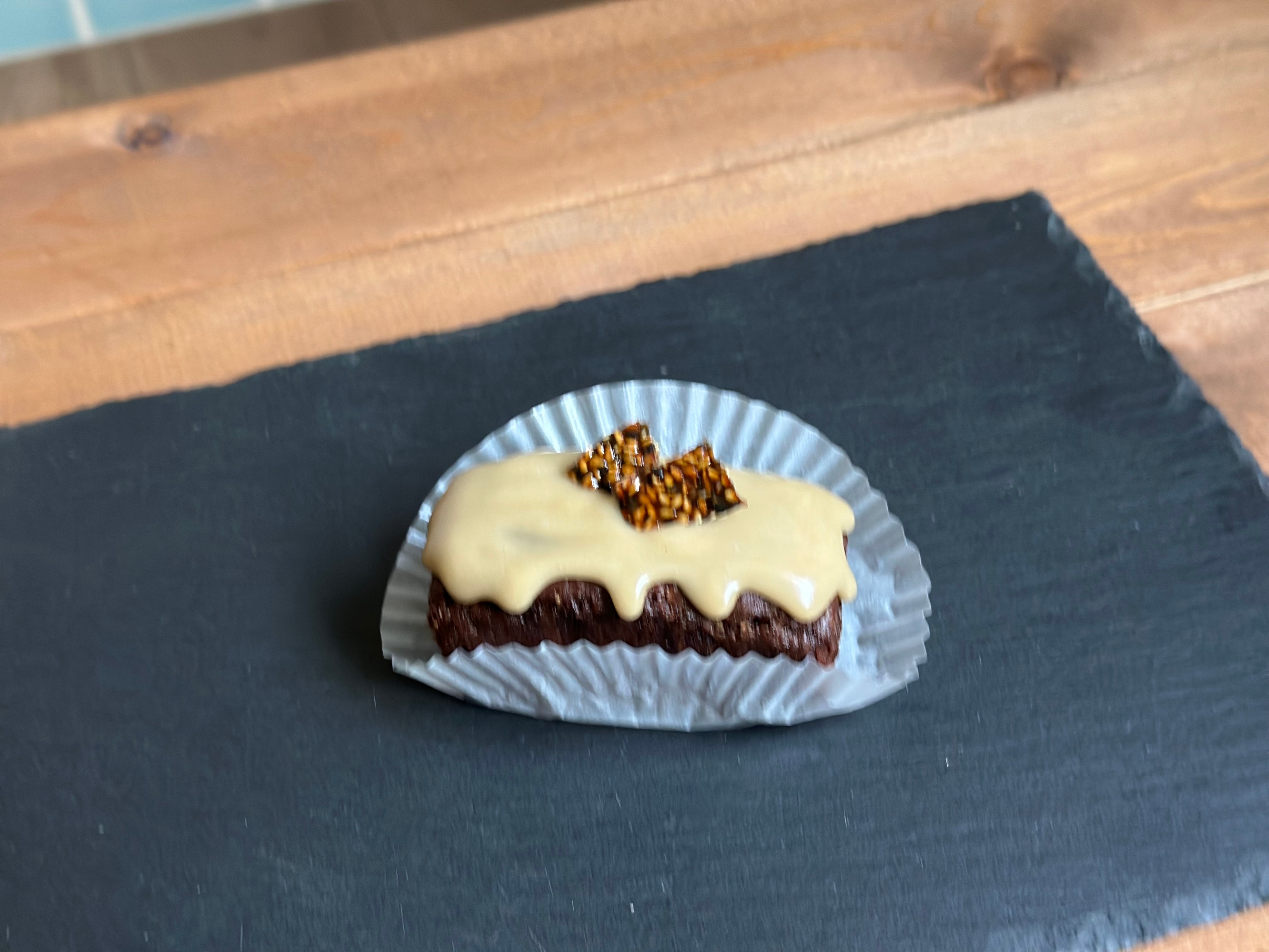 タヒニという胡麻ペーストを使った甘さ控えめのチョコケーキです。トッピングのゴマブリットルの香ばしさがアクセントになっています。