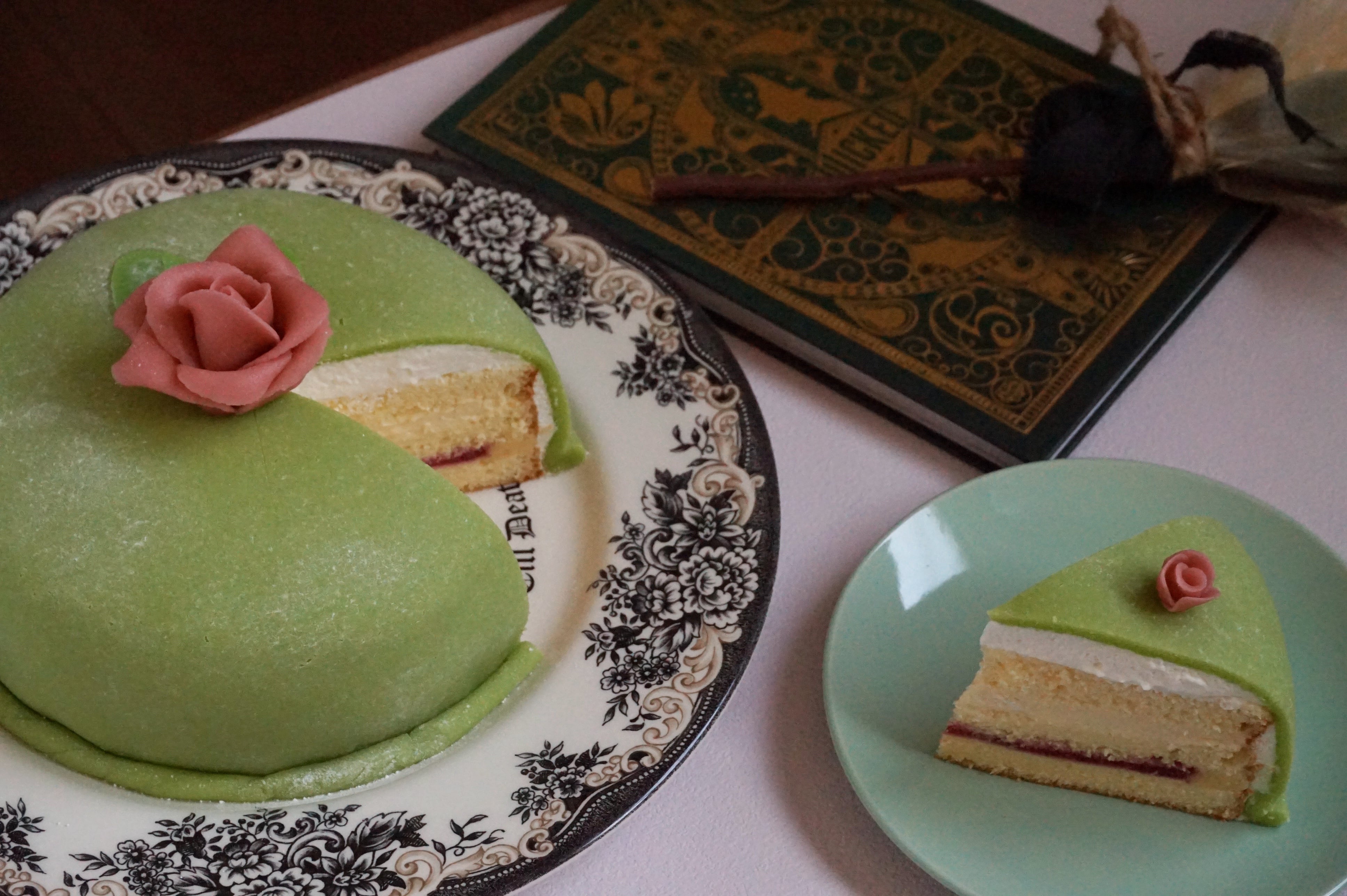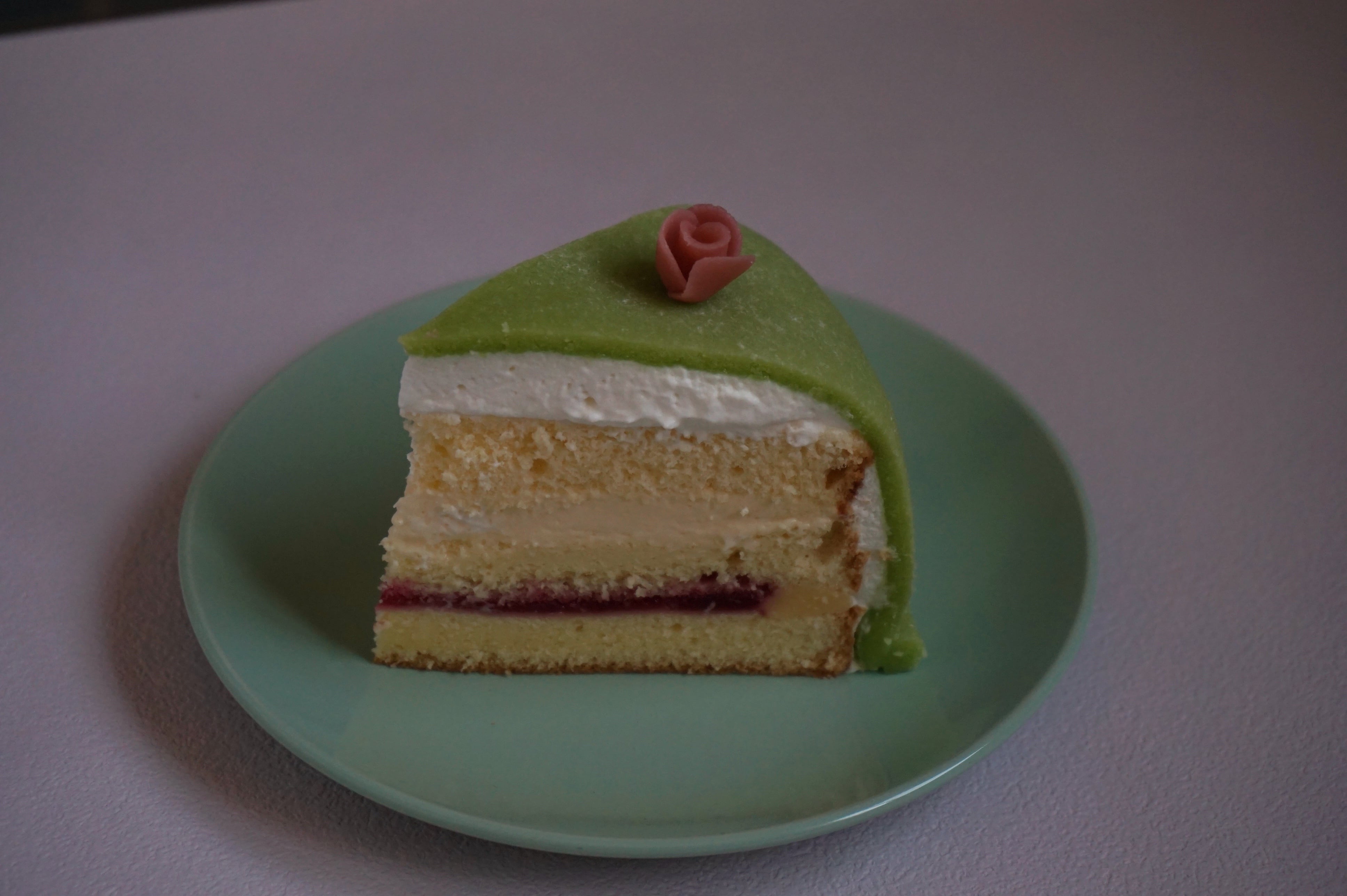 ジェノワーズ生地にカスタード+ラズベリージャム、カスタード+生クリーム、生クリームの3段重ねを自家製マジパンでカバーしています。