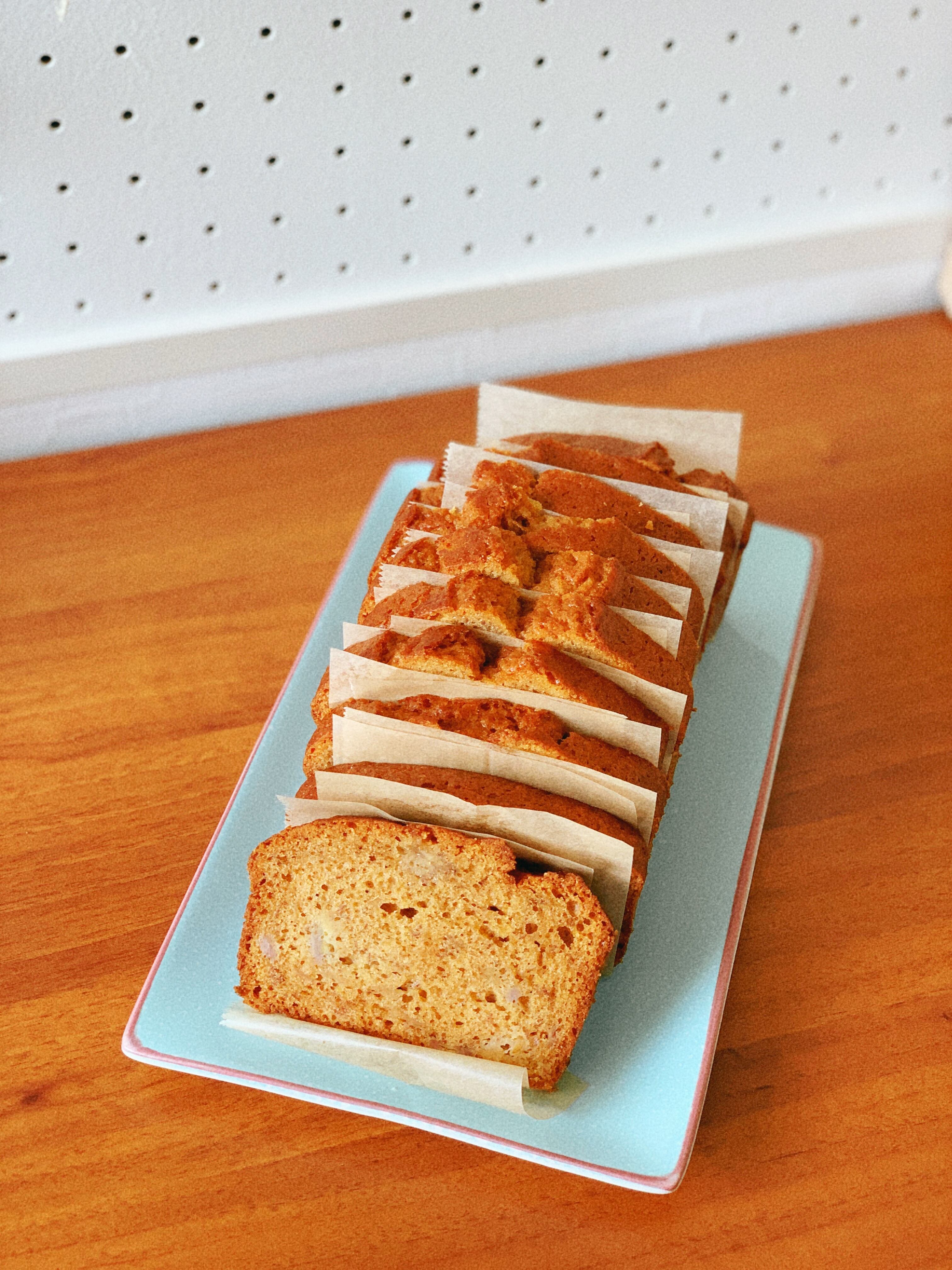 キャラメルソースと合えたバナナをたっぷり使ったしっとりバナナケーキです。