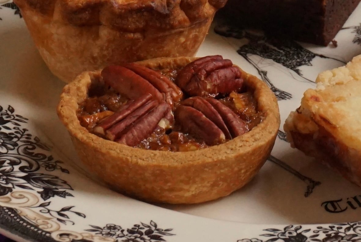 ゴールデンシロップを使ったコクのあるむっちりとした生地にザクザクのピーカンナッツがよく合うピーカンパイです。
